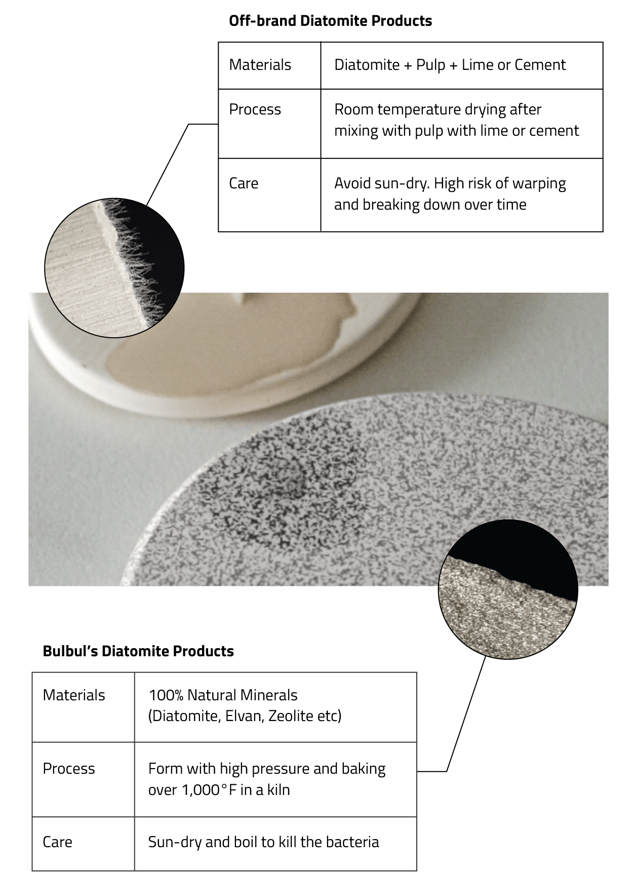Bulbul’s diatomite products are crafted without chemical bonding agents, using natural minerals and diatomite.